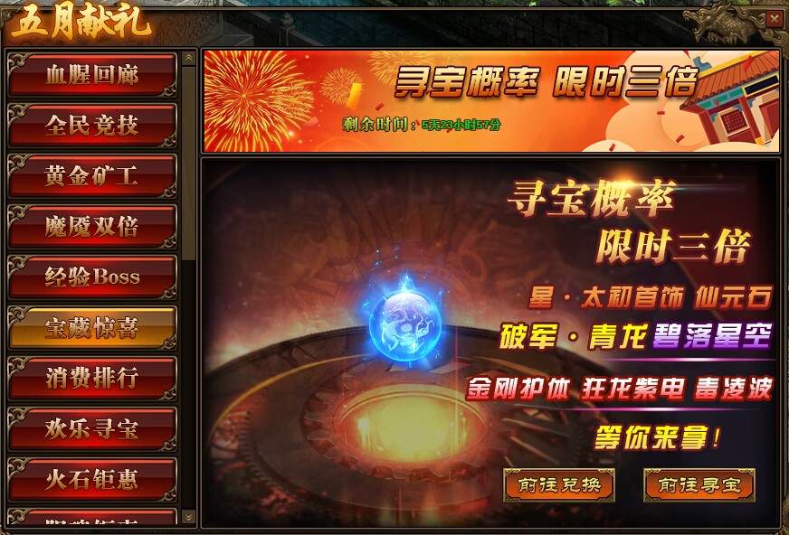1.活动期间,玩家寻宝概率翻倍,极高几率获得星·太初首饰,特戒钢纹、仙元石、碧落星空,传世灵器、传世灵甲,封神秘法书页以及破军·青龙