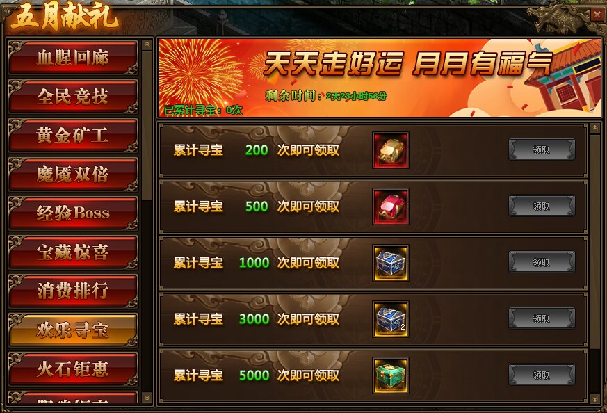 1.活动期间,玩家累积寻宝次数满足要求,可以领取本职业星石、本职业仙装、传世仙装等相应奖励;