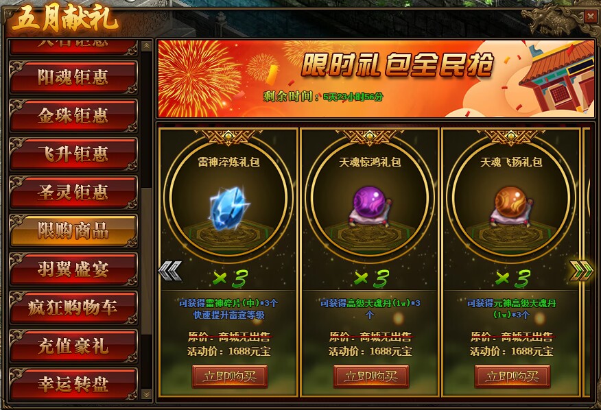 1.活动期间,玩家可在活动面板购买限购商品;(可翻页)