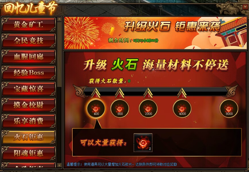 1.活动期间,玩家获得火石碎片数量,达到条件可领取对应火石碎片奖励。