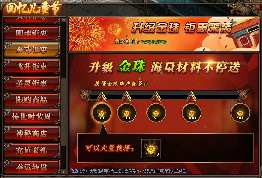 1.活动期间,玩家获得金珠碎片数量,达到条件可领取对应金珠碎片奖励。