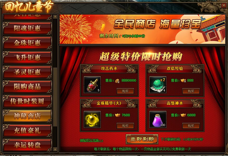 2.神秘商店每2小时自动刷新一次,也可用花费元宝立即刷新;