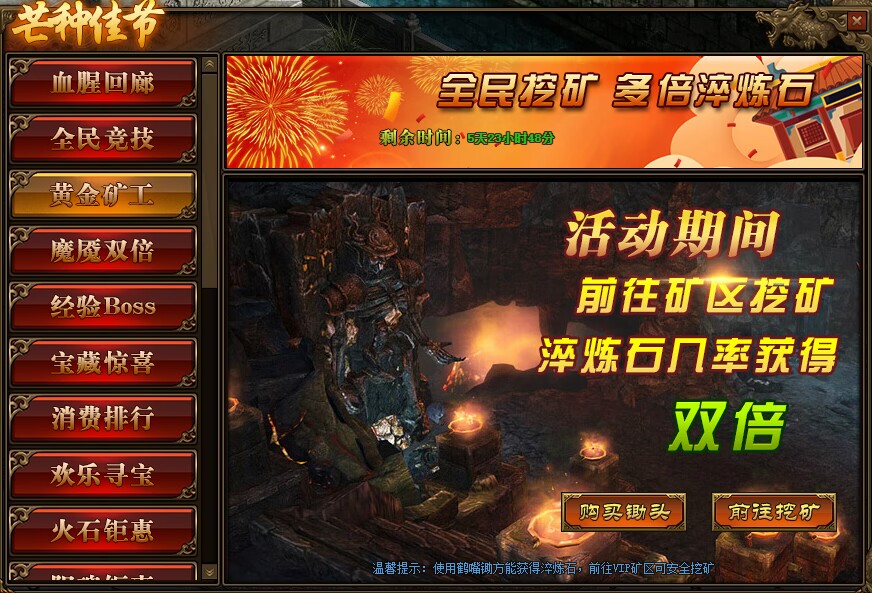 2.注意:必须使用“鹤嘴锄”才可获得“淬炼石”,在VIP矿区可安全挖矿;