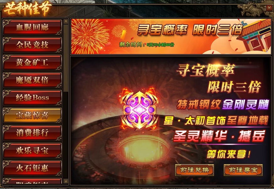 .活动期间,玩家寻宝概率翻倍,极高几率获得星·太初首饰,传世灵器、传世灵甲,特戒钢纹,仙元石、碧落星空,传世灵器、传世灵甲,金刚灵髓、金刚精华,至尊风扬阵法以及圣灵精华(撼岳);