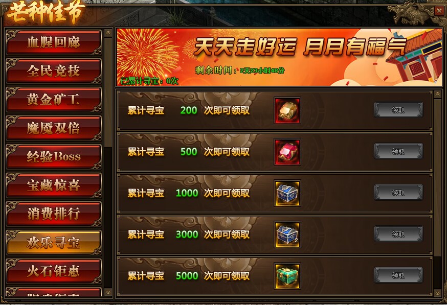 1.活动期间,玩家累积寻宝次数满足要求,可以领取本职业星石、本职业仙装、传世仙装等相应奖励。