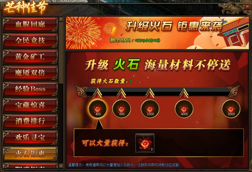1.活动期间,玩家获得火石碎片数量,达到条件可领取对应火石碎片奖励。