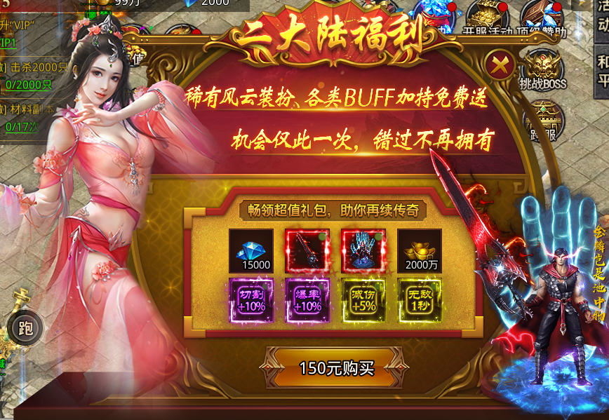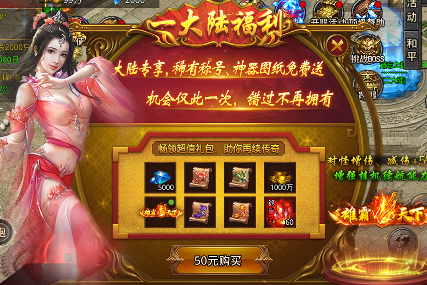 1:BOSS降临活动持续3天,每天21:30刷新福利圣兽一只,刷新地图:比奇城 ,刷新坐标:156 150