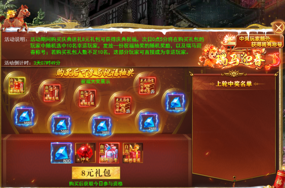 参与庆典送礼祝福抽奖,幸运玩家可额外获得稀有称号“瑞马迎春”!