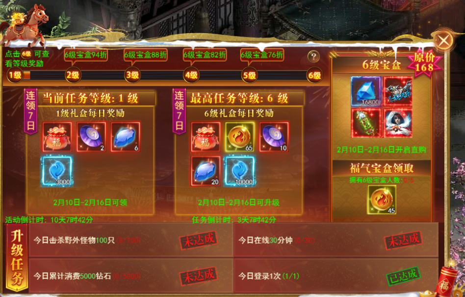 任务阶段达标每日目标升级宝盒,奖励阶段每日领取宝盒奖励,最高可免费升至5级宝盒,直购6级宝盒可领时装大礼!