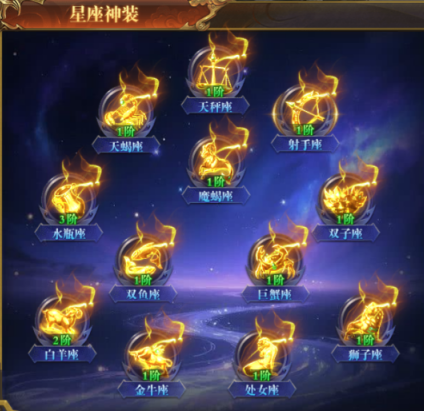 收集星座神装可获得大量稀有属性,集齐全套十二星座神装还可激活强力技能--十二宫守护: