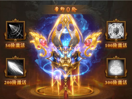 消耗帝印精华(可通过域外战场、域外征战、剑神传功获取)可升阶帝印,提升帝印至指定阶级可激活技能效果: