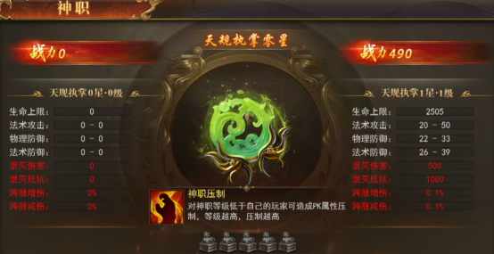 消耗灵玉和神职卷轴可升级神职,对神职等级低的玩家可造成PK属性压制,等级越高,压制越高。