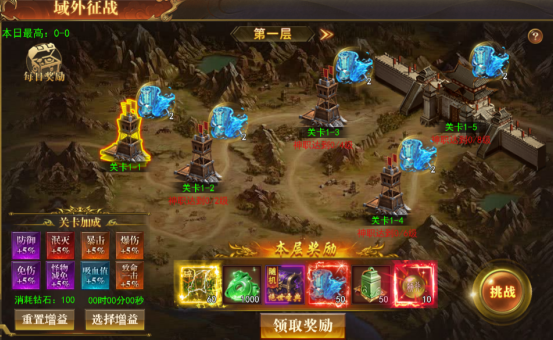 跨服副本地图,不同层数所需要的战旗装备不同,层数越高,奖励越好;