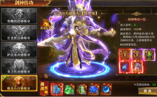 个人副本,通过激活传功令牌可进入不同的修炼室,修炼室越高级,奖励越好;