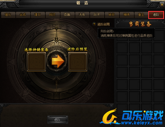 玩家可在锻造页“进阶”界面,对已神铸过的装备进行神铸属性进阶