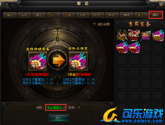 消耗“传说神铸石”可将“史诗”属性的神铸装备进阶至“传说”