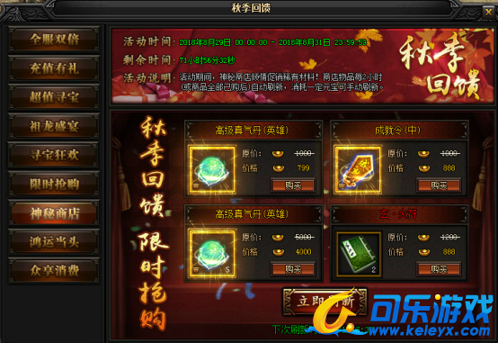 活动说明 : 活动期间,神秘商店倾情促销稀有材料!商店物品每2小时自动刷新(或全商品全部已购后),消耗一定元宝可手动刷新。