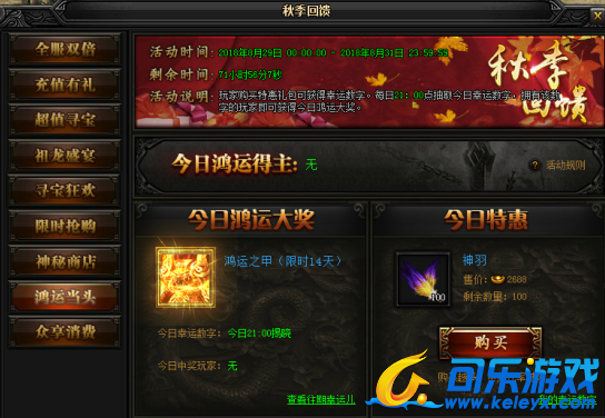 活动说明 : 玩家购买特惠礼包可活动幸运数字。每日21:00抽取今日幸运数字,拥有该数字的玩家即可获得今日鸿运大奖。