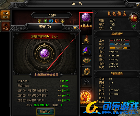 点击角色/英雄界面的“黑暗淬炼”按钮,可打开黑暗淬炼界面