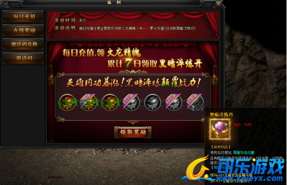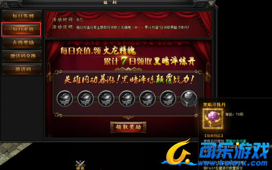 每日充值任意金额即可领取奖励:火龙精魄(中)*1,累计7日后可领取“黑暗淬炼丹”