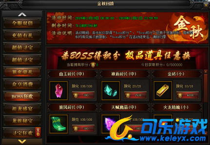 活动说明 : 活动期间内,击杀BOSS获得“boss积分”,“boss积分”可用于兑换材料,每种材料均有兑换次数限制,“boss积分”在活动结束后,清除归零