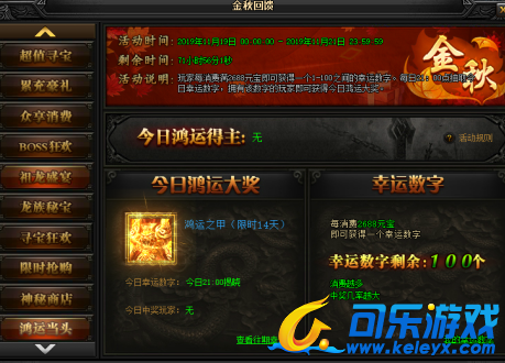 活动说明 : 玩家每消耗2688元宝即可获得一个1-100之间的幸运数字。每日21点抽取今日幸运数字,拥有该数字的玩家即可获得今日鸿运大奖。