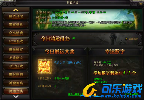 活动说明 : 玩家每消耗2688元宝即可获得一个1-100之间的幸运数字。每日21点抽取今日幸运数字,拥有该数字的玩家即可获得今日鸿运大奖。
