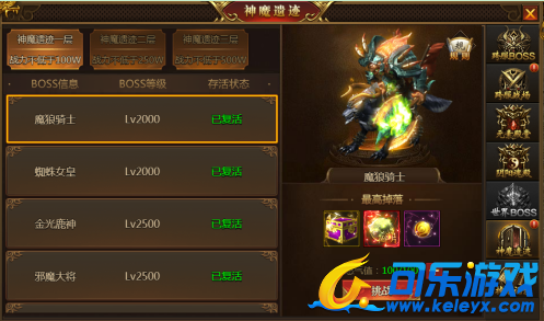 玩法说明:神魔遗迹有多层,每层都栖息着众多BOSS,玩家进入需要达到一定的战斗力条件,里面的BOSS有着非常丰厚的掉落。每天0点玩家会刷新100点怒气值,在神魔遗迹里面击杀BOSS并获得归属奖励后会扣除一定怒气值,怒气值为0时获得BOSS归属不会获得奖励。在遗迹中死亡掉落装备的概率是普通地图的一半,遇到困难可向帮派成员发起协助请求,协助者可助你抢夺BOSS归属,协助者成功帮协助发起者获得BOSS归属奖励后会获得秘法石奖励,协助可获得秘法石上限与世界BOSS协助奖励共享。