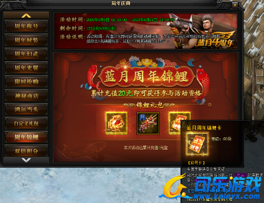--活动期间,充值20元即可获得抽取锦鲤资格,在活动结束后系统将对全平台符合资格的玩家进行随机抽取,抽出1名锦鲤玩家,奖励“4周年锦鲤大礼包”