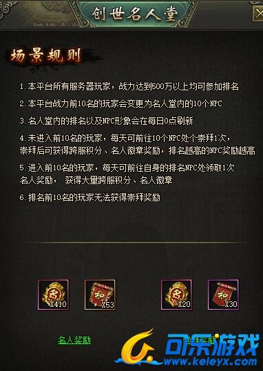 1)未进入前10名的玩家,每天可前往10个NPC处各崇拜1次,崇拜后可获得跨服积分、名人徽章奖励,排名越高的NPC奖励越高