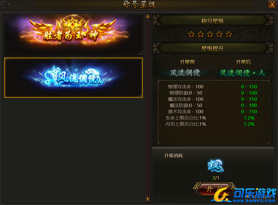 1) 开服达到80天时,部分永久称号会开启星级功能,可使用相同的称号道具对该称号进行升星,并提升该称号的属性;