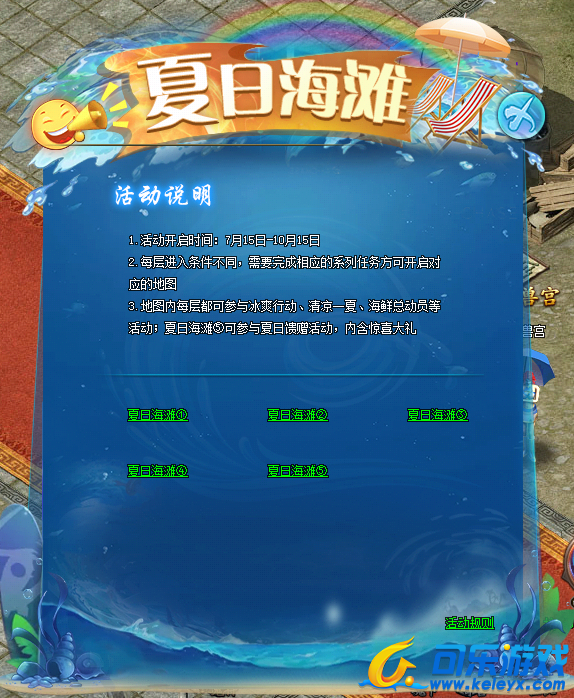 (1)开启条件:7月15日-10月15日,等级达到200级的玩家,可通过点击激爽夏日ICON打开界面