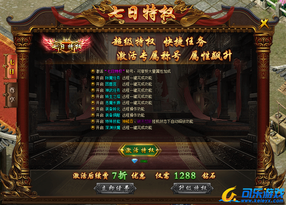 (2)玩家可花费钻石购买7日特权,激活专属称号并享受专属特权