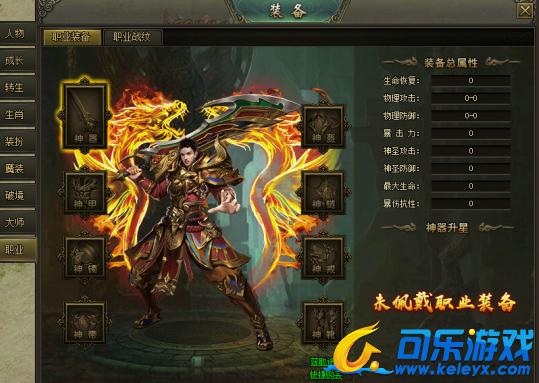(2)职业装备分为神器、神甲、神盔、神链、神镯、神戒、神带、神靴8个部位