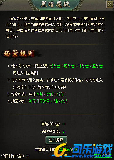 (1)进入条件:玩家转职成为怒战士,可通过点击封魔古都NPC“黑暗魔狱”打开界面