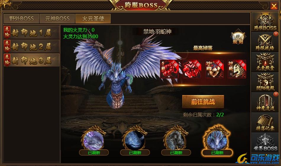 1. 达到条件的玩家可以进入封印之地跨服地图,封印之地目前开放3层,根据玩家火灵力的属性可进入不同层,火灵力属性可从火元神装备获取。