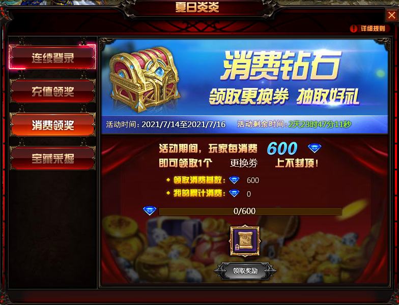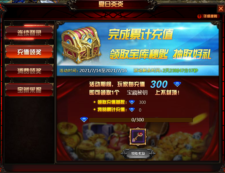 每充值300钻石可获得1个“宝藏秘钥”,每消费600钻石可获得1个“更换券”。