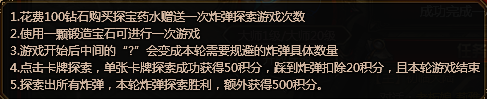 活动内容:活动时间内,玩家可以花费100钻石或1个锻造宝石购买探宝药水并获赠一次炸弹探索游戏次数。