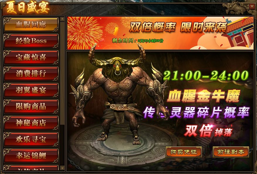 1.活动期间,玩家参与“多人副本-血腥回廊”,获得“传世灵器碎片”的概率翻倍;