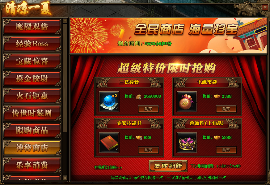 2.神秘商店每2小时自动刷新一次,也可用花费元宝立即刷新;