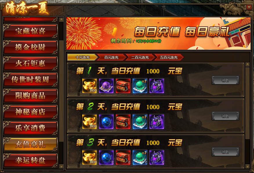 2.连续充值达到3天,奖励翻倍领,更可领取暗影晶石、地狱晶石、随机阵法宝珠宝箱等贵重物品