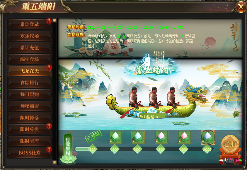 活动期间内,消耗龙舟桨可以使龙舟前进,每次划动可增加100行驶里程。达到指定的里程后,可以获得超值奖励。龙舟行驶的越远,奖励越好。