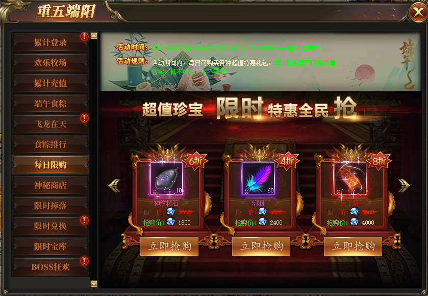 活动期间内,每日可购买各种超值特惠礼包,每个礼包每日限购数量售卖,机不可失,失不再来!