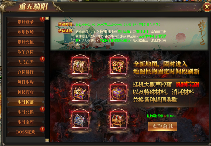 活动期间内,进入地图杀怪掉落限时宝箱以及限时材料。宝箱可开出各种超值奖励,同时消耗材料可兑换各种宝箱。宝箱跟材料有时间限制,请及时使用。地图里的怪物整点刷新,活动结束后,地图自动关闭。