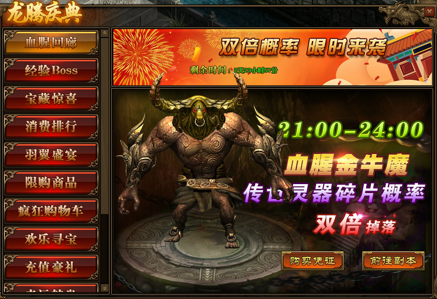 1.活动期间,玩家参与“多人副本-血腥回廊”,获得“传世灵器碎片”的概率翻倍;