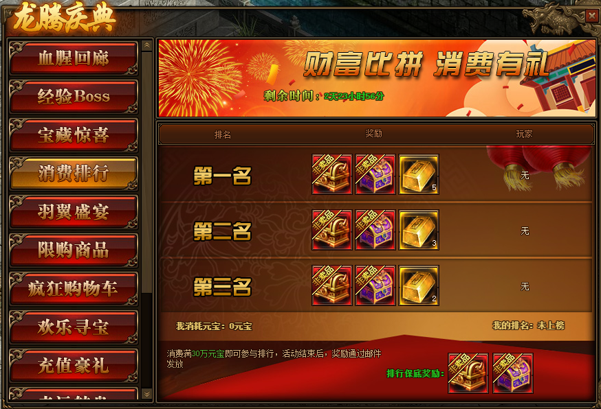 1.活动期间,玩家消费满30万元宝参与排行