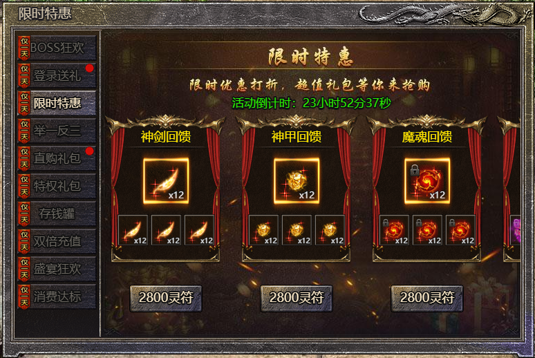 1.活动期间,玩家可在活动面板购买限购礼包,神剑特惠、神甲特惠、魔魂特惠、徽记特惠、经脉特惠、神阶特惠、荒古特惠、蛮王特惠