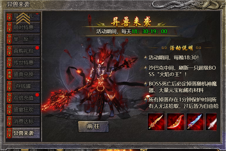 1.活动期间,每晚18:30将在沙巴克中间刷出一只超级BOSS;