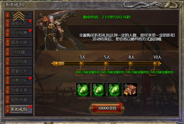 1.全服购买折扣礼包达到一定的人数,即可享受一定的折扣;
