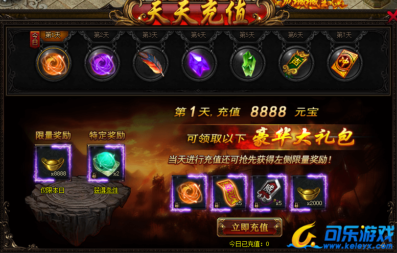 活动期间,开放天天充值活动,活动期间充值达到指定金额可以领取超值大奖。累计7天充值达到指定金额可以领取绝版酷炫强力称号:冲破云霄